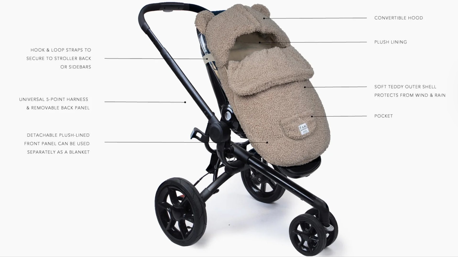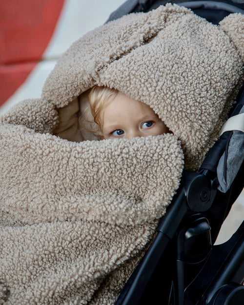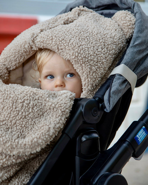 The BébéPOD Teddy is the perfect sweatshirt-like infant bunting for milder temperatures featuring a soft plush lining and a fluffy teddy outer shell for maximum comfort. Adapt the BébéPOD to your car seat or stroller as you see fit. This snuggly teddy footmuff has a detachable cover that turns into a single-panel blanket on warmer days where the back is not a necessity. When it’s crisp outside and the family is ready for a stroll, the BébéPOD Teddy will cradle baby to sleep in no time.