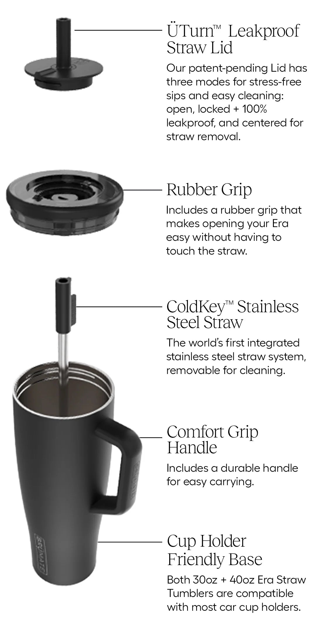 Match your Mini with A new Era of straw tumbler. Our Era tumbler is totally leakproof, and made for stress free sips on the go. It has our fully leakproof Ü-Turn™ lid that works for both cold and carbonated beverages, ColdKey™ metal straw for minimizing the amount of plastic sitting in your water, SoftSip™ silicone straw so every sip feels like a luxury, BevGuard™ technology to keep drinks cold for 24+ hours, and a cup-holder friendly base so you can enjoy 40oz of your favorite beverage, free of leaks and spills throughout your daily journey.