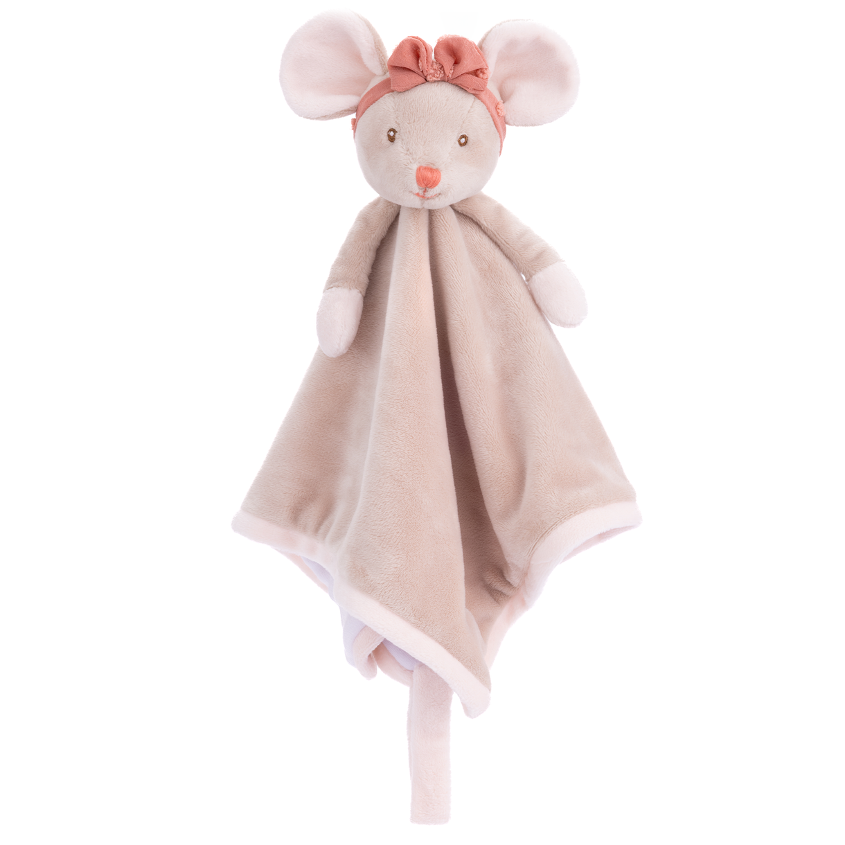 Sweet Karolina Blankie is a soft and cuddly comfort blanket featuring the lovable Sweet Karolina mouse. She has gentle stitched features, large plush ears, and wears a peach bow headband. The attached blanket is made from ultra-soft fabric in a soothing beige tone with light pink trim, perfect for snuggles and comfort anytime.