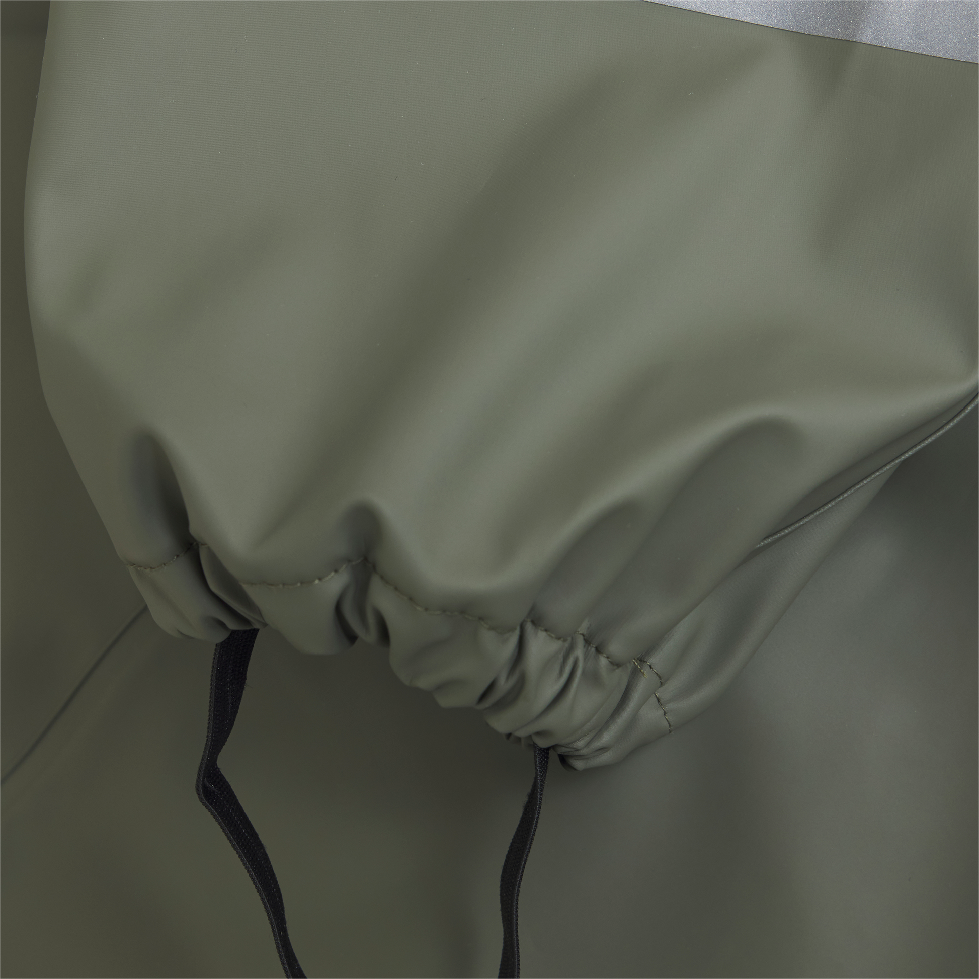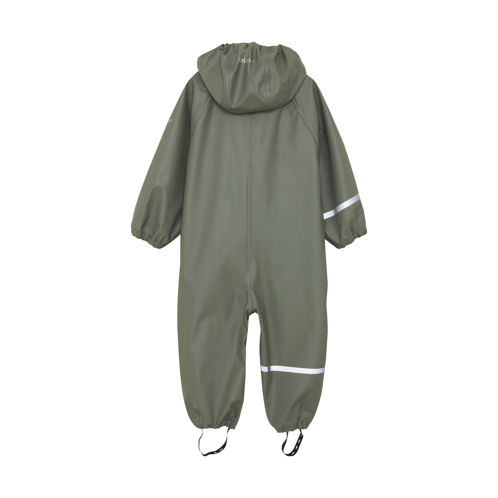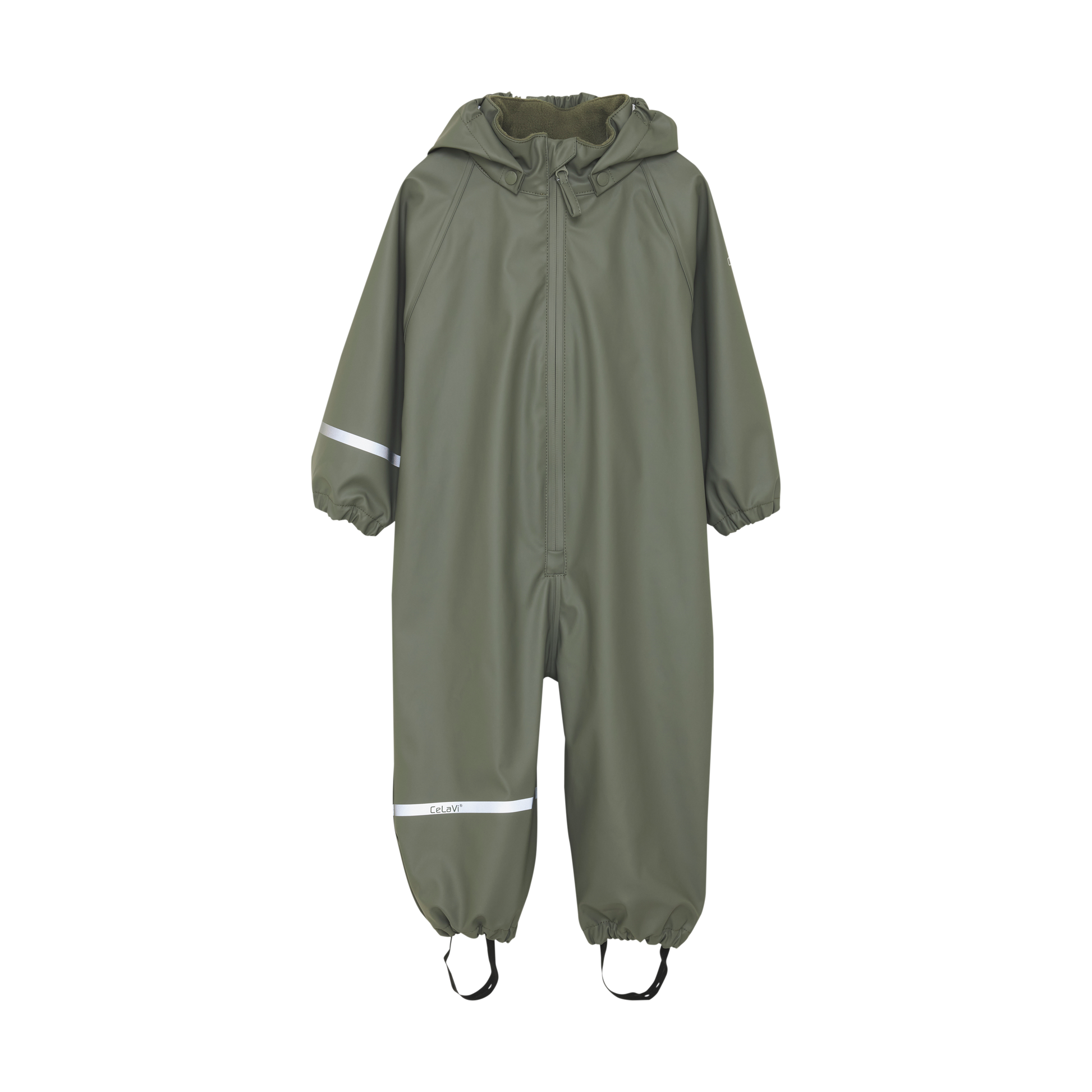 The rain suit is solid-colored. There are narrow reflective stripes around one arm and one leg. At the top of one arm and on the back of the hood, the logo is printed with a reflective finish. The CeLaVi rain suit has a detachable hood that is fastened with snap buttons at the collar. It closes in the front with a waterproff zipper. The hood opening, sleeves, and waist have elastic for a better fit. The trousers have practical and adjustable elastic straps that can be pulled under the footwear. The rain suit has a water column pressure of 10,000 mm.  Certified acc. to GRS - Made with 66% Recycled Material CERES-0366