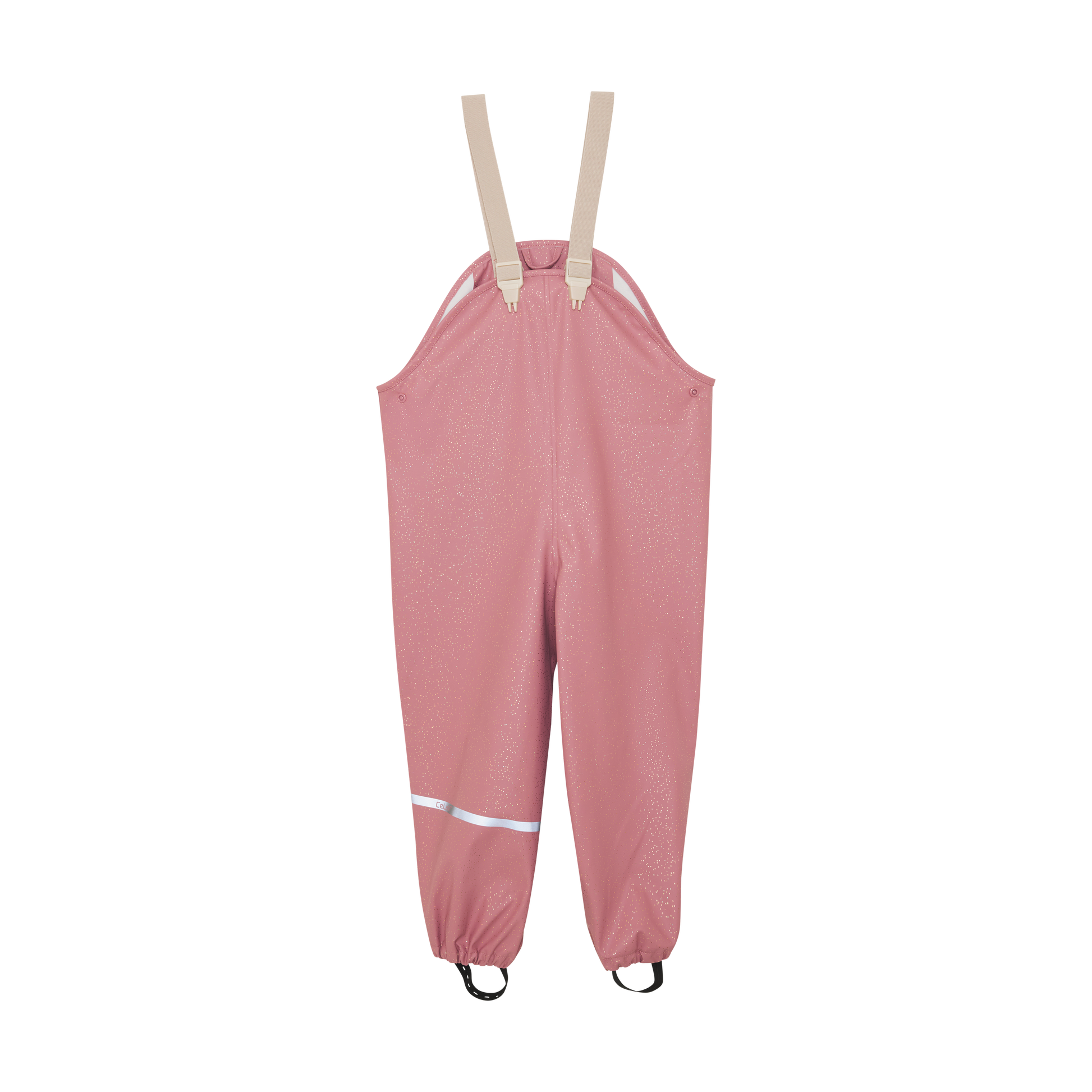 The set consists of a jacket with an all-over glitter print and a solid-colored bottom. The trousers have adjustable suspenders and click buckles up to size 3/4y, after which they come without suspenders. The trousers have practical and adjustable elastic straps that can be pulled under the footwear. The jacket closes with a waterproff zipper. There are narrow reflective stripes around one arm and one leg. At the top of one arm and on the back of the hood, the logo is printed with a reflective finish. The CeLaVi rain jacket has a detachable hood that is fastened with snap buttons. The hood opening, sleeves, and waist have elastic for a better fit. The set has a water column pressure of 10,000 mm.