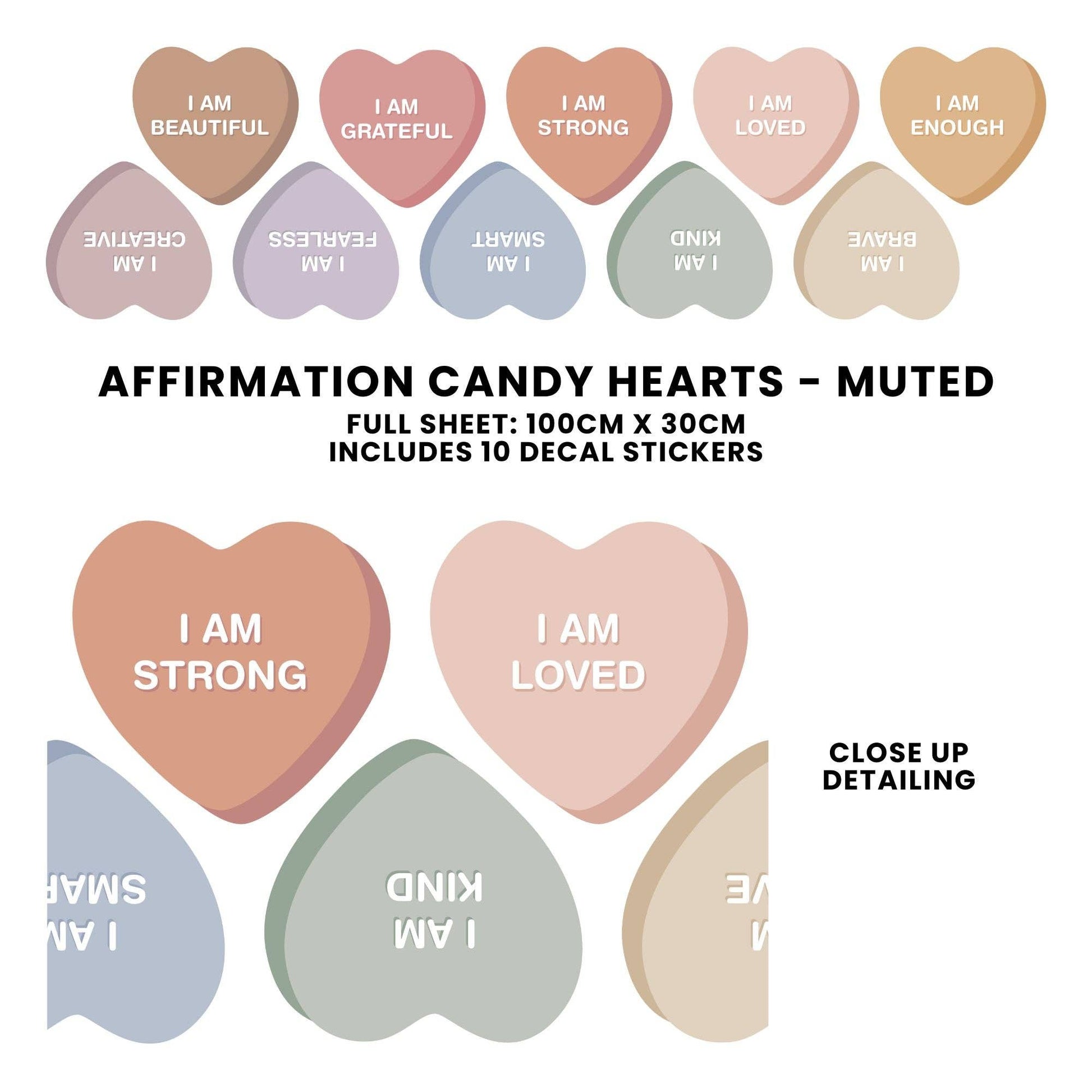 Reusable Fabric Wall Stickers - Affirmation Candy Hearts (Muted) Add a pop of personality to any room with our Peel & Stick Wall Decals. Designed to bring joy to kids' spaces, these reusable fabric stickers make it easy to refresh your walls with no wallpaper, no commitment, no mess. Affirmation Candy Hearts (Muted) set includes 10 decal stickers. Full sheet size: 100x30cm. Why we love them: * Designed and made in Canada using premium self-adhesive fabric (not vinyl!) * Eco-friendly and non-toxic for peace of mind * Smooth, matte finish * Removable, repositionable, and reusable — stick, peel, and stick again! * Safe for walls and perfect for renters * Each set is professionally printed in small batches