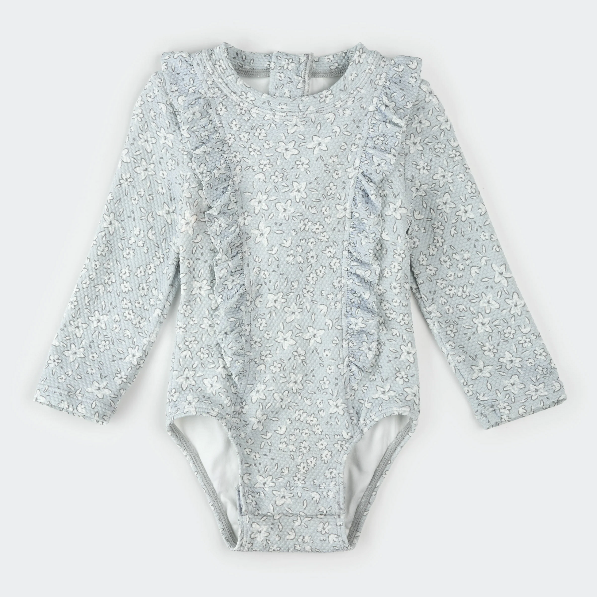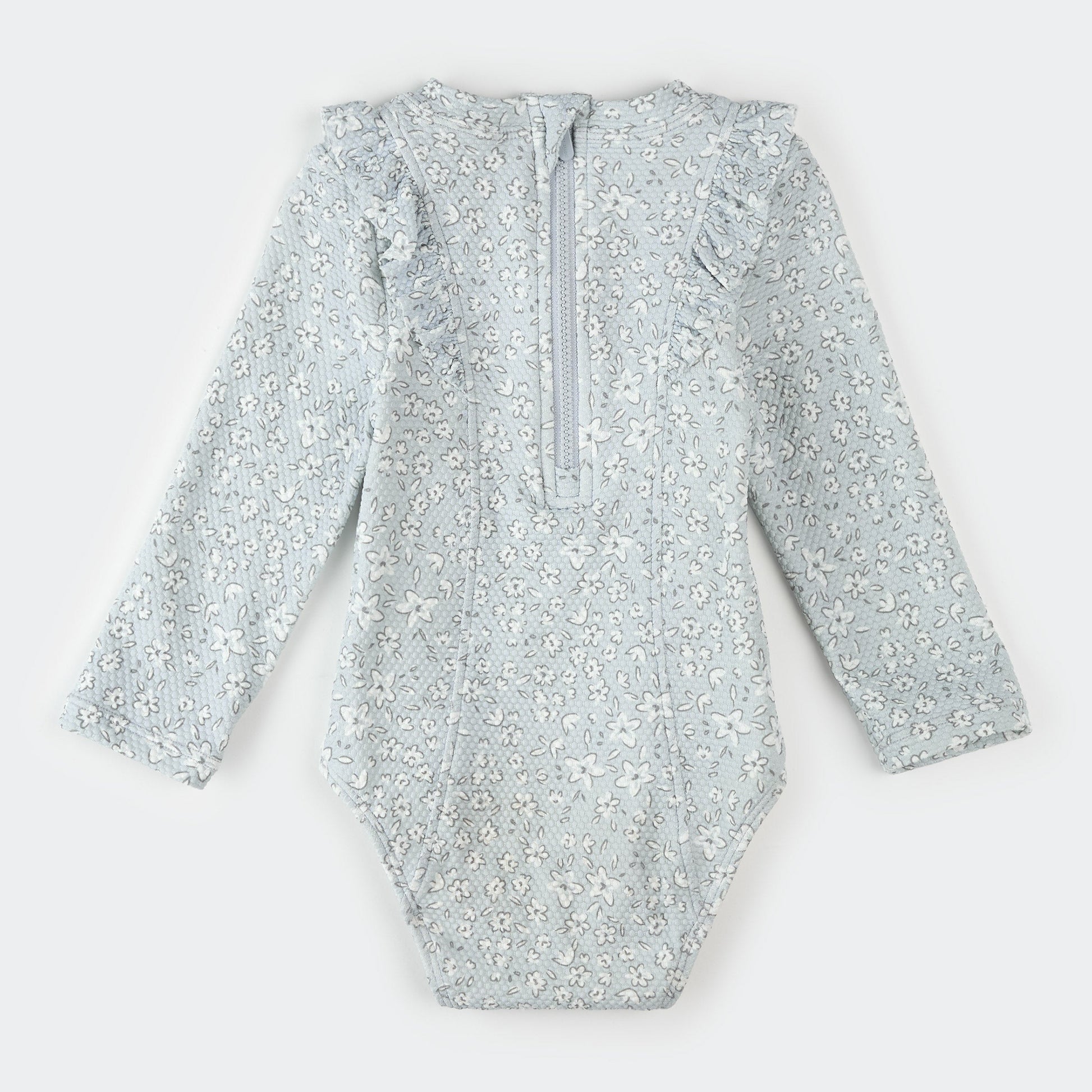 Fresh and floral, this pastel blue one-piece offers a charming vintage style for summer days by the water. With long sleeves and built-in UPF50+, the piece allows her to stay covered up and comfortable in the sun. Made from a quick-drying, waffle textured fabric, the piece has all the flexibility she needs to splash, wiggle, dive and giggle. A zip at the back makes dressing simple so she can switch from water to playtime in no time at all.