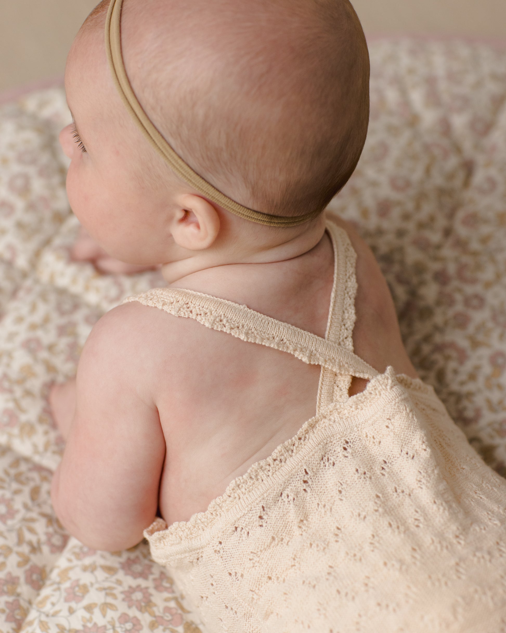 Our Annie Knit Romper features knit scallop edge detail on straps and neckline with snaps at the bottom for easy changes.